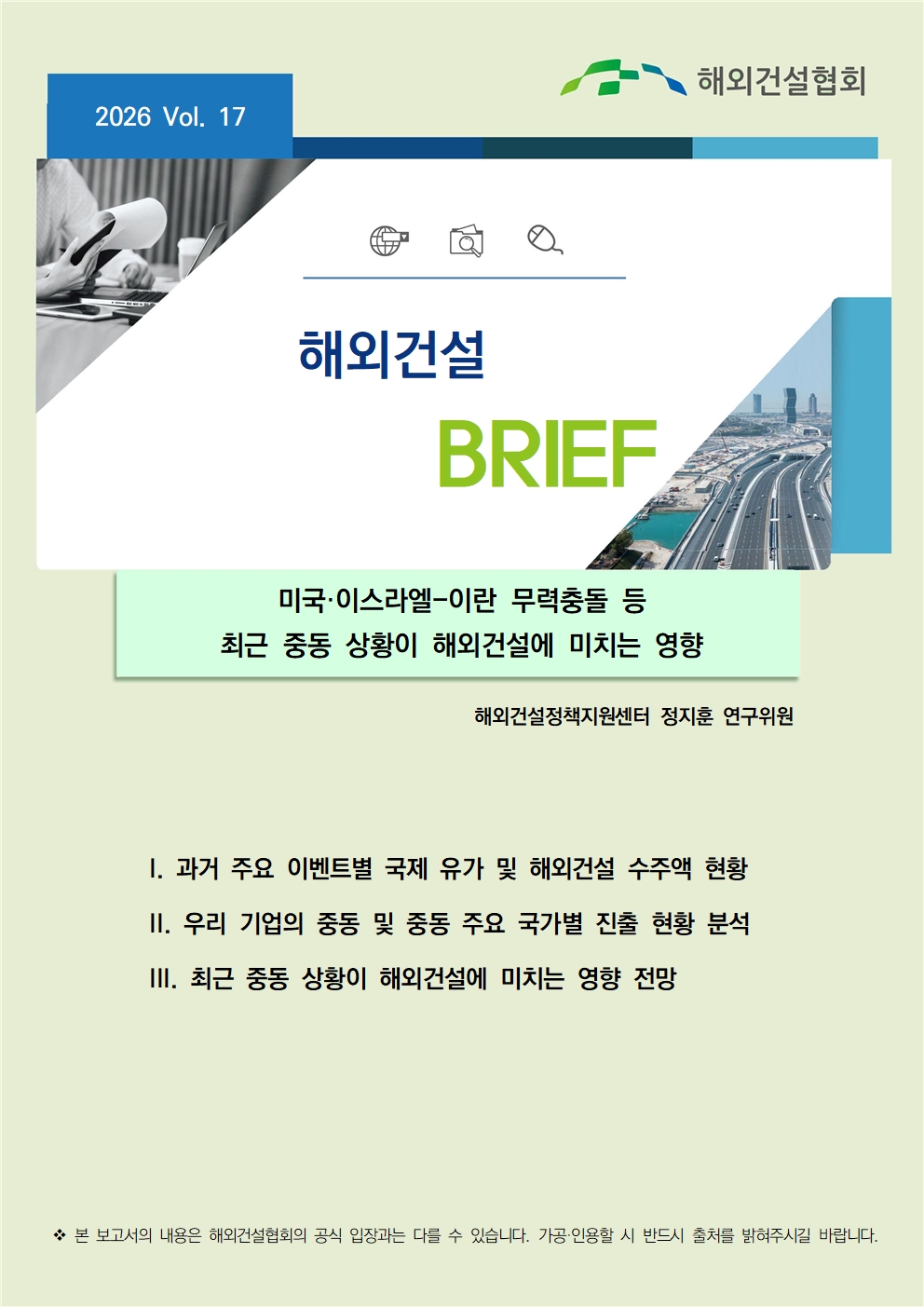 미국·이스라엘-이란 무력충돌 등 최근 중동 상황이 해외건설에 미치는 영향I. 과거 주요 이벤트별 국제 유가 및 해외건설 수주액 현황<br> II. 우리 기업의 중동 및 중동 주요 국가별 진출 현황 분석<br> III. 최근 중동 상황이 해외건설에 미치는 영향 전망2026-03-09