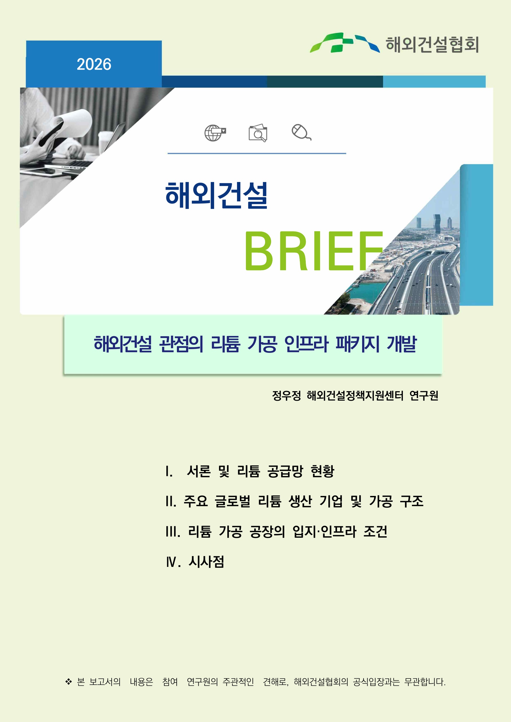해외건설 관점의 리튬 가공 인프라 패키지 개발I. 서론 및 리튬 공급망 현황 II. 주요 글로벌 리튬 생산 기업 및 가공 구조 III. 리튬 가공 공장의 입지·인프라 조건 Ⅳ. 결론 및 시사점2026-04-08
